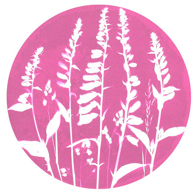 In honour of 'Open Studio Pink' - (the magenta used on the Open Studios logo and literature) I've given on of my cyanotype cards a make-over via the marvel that is Photoshop. The foxgloves seemed the ideal subject for this shade of deep pink.